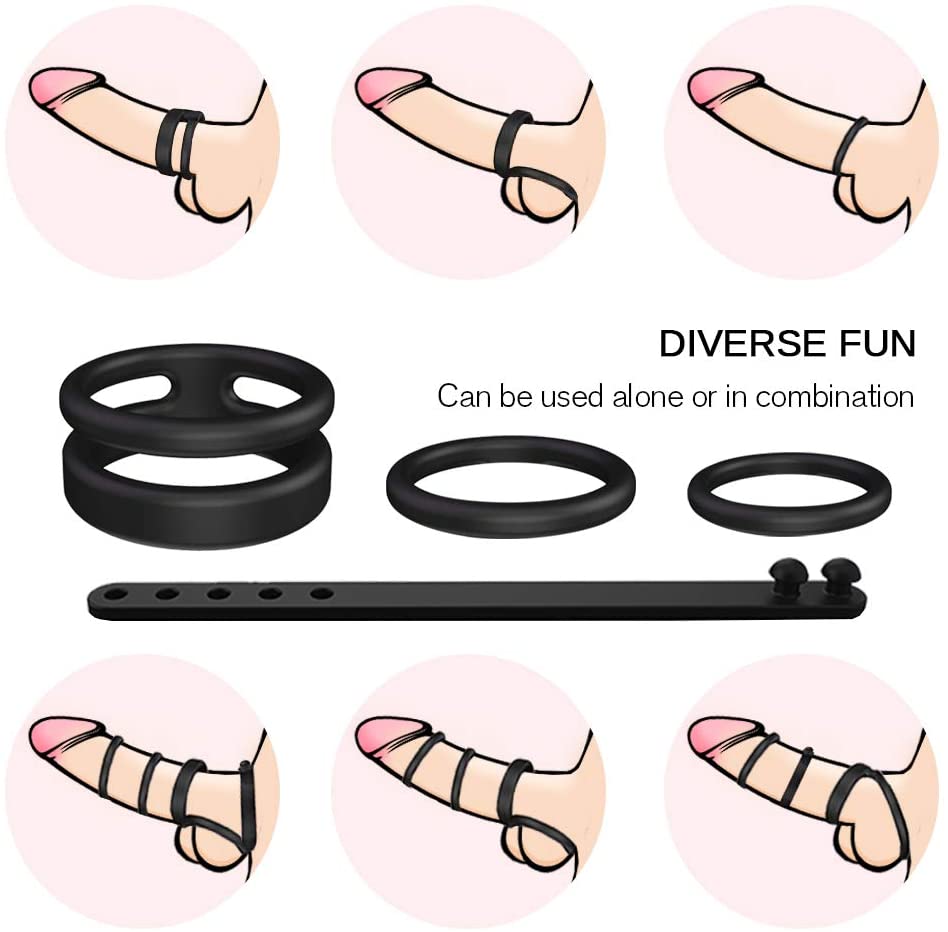 - MULTI CHOICES - 4 silicone cock rings can be used alone or in combination for diverse fun. The Dual Ring is designed for penis and testicles, to help enhance erections, while the Adjustable Ring allows you to enjoy pleasure with the most perfect size. And, the 2 Different Size Rings will also help you double your pleasure and last longer.